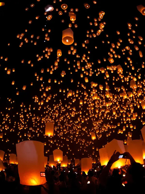 Yi Peng (Sky Lantern Festival) is a traditional Northern Thai celebration where thousands of glowing lanterns are released into the sky, symbolizing the release of misfortunes and the welcoming of blessings.